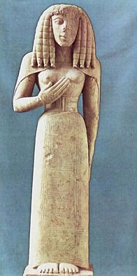 - Az Auxerre-i istennő (Louvre, Párizs) az i. e. 650 körüli időből. Szemonidesz talán még gyerek, talán már felnőtt volt. A szobor mindössze 65 cm magas. A kéztartást egyfajta vallásos szimbólumként értelmezik a szakértők, akik szerint ennek a szobornak a kéztartása „mintha áhítatot vagy éppen esküvést” fejezne ki.